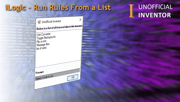 I've written an iLogic rule that gathers the names of all of the internal rules in a file, and then shows them on an input list box. The user can run any rule on the list by clicking on the rule in the list. This could be quite useful for users, as it could pop... Continue Reading →