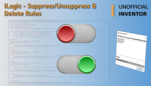 You may need an easy way to delete, suppress or unsuppress iLogic rules in an Inventor file. Generally you may want to delete internal rules in files, as running rules externally is often better (maybe I'll explain my thoughts in another blog post). Doing this is quite simple, see the line of code below. iLogicVb.Automation.DeleteRule(DocumentName,... Continue Reading →