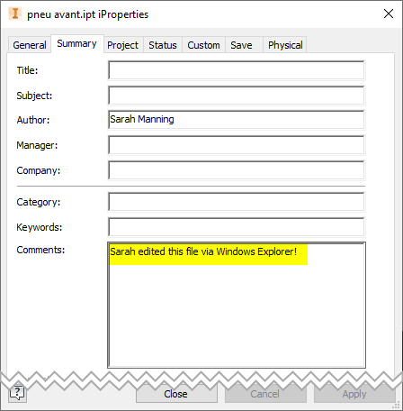 After clicking yes, the normal Inventor iProperties are displayed, with the changes from Windows Explorer.