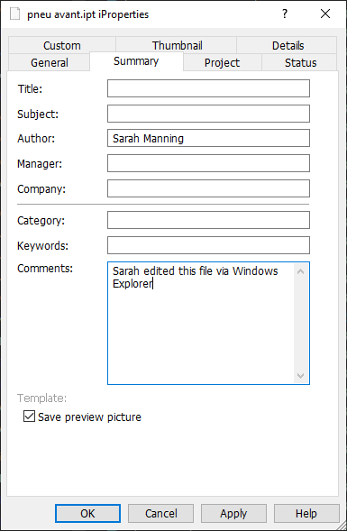 An iProperties dialogue will pop up, it’s very similar to what you see in Inventor, you can edit iProperties from here, clicking Apply will make the changes to the file.