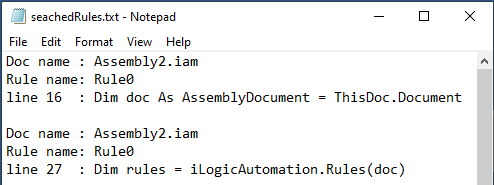 I created a rule that that can search all rules in each part in an assembly (or just in a part). To use this iLogic utility, just save it as a external rule. Check that the variable “outputFile” is pointing to a file location that you have write access to. (it’s not necessary to create the file. It will be created if its not there.)