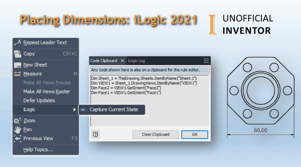 Using "Capture Current State" to Automate Dimensions with iLogic. iLogic in 2021 introduces the ability to add dimensions to drawings and to capture the state of selected geometry on a drawing view. In this example I'm going to show you how to create a linear dimension. In the image below I have named some faces... Continue Reading →