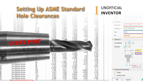 Guest post by Tanner Dant I recently came across a new challenge while working in Inventor. By default, Inventor does not include ASME standard clearances in the hole command, and I needed to use them for my project. A little internet sleuthing showed me a way to add data to the hole command dialog, and... Continue Reading →