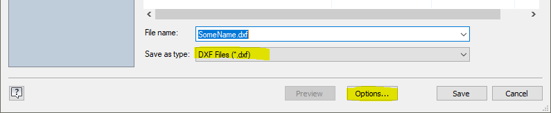 In the “Save as type” dropdown, select DXF and click “Options”.
