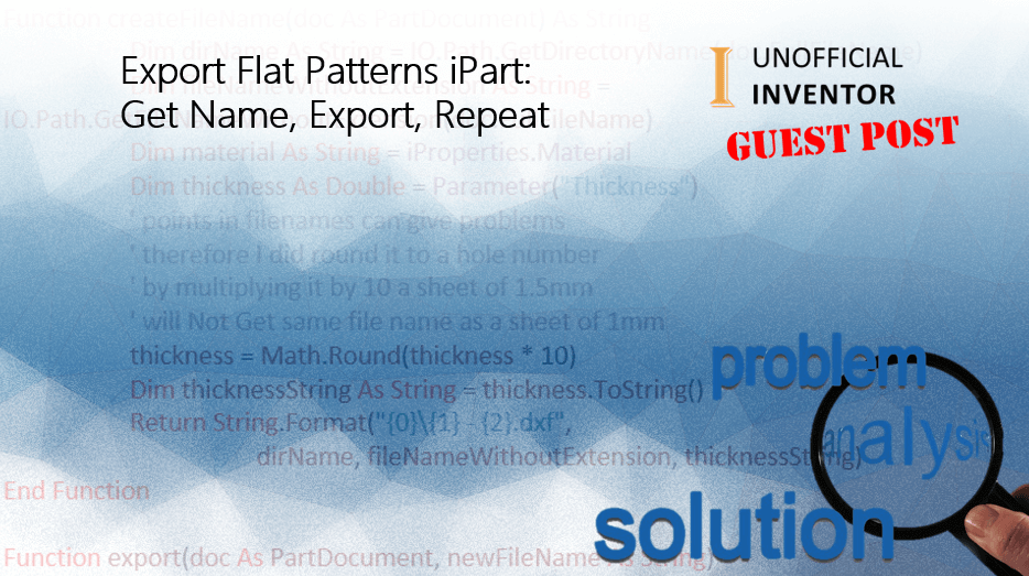 I’ve recently seen several questions from people looking to save or export files automatically. Questions like “How to perform ‘save a copy as’ PDF for a list of Inventor drawings from an excel?” and “Automate iPart flat pattern export to DXF”. That is why I wrote this post, explaining how you can write your own iLogic export rules. In this post I will try to explain my thoughts while writing an export rule. As an example I will use the question: “Automate iPart flat pattern export to DXF”