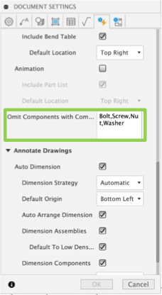 The “Omit list” allows a user to set additional components to ignore. Default settings are “Bolt, Screw, Nut or Washer”. This list is customisable & should be set in the drawing template.